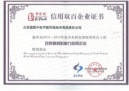 當前位置: 國能中電公司動態> 我公司被評為2014-2015年度中關村信用培育雙百工程“百家最具影響力信用企業”