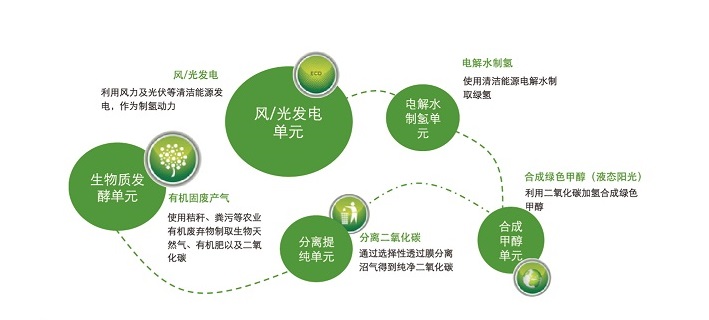 風(fēng)光生物質(zhì)聯(lián)合制儲(chǔ)氫(液態(tài)陽光)一體化碳中和技術(shù)是國能中電以國家“雙碳”目標(biāo)為指引,在自身優(yōu)勢(shì)的生物質(zhì)能技術(shù)基礎(chǔ)之上,打破產(chǎn)業(yè)壁壘,融通產(chǎn)業(yè)鏈條,成功孵化的以風(fēng)能、太陽能、生物質(zhì)能、氫能等清潔能源為代表的一體化碳中和項(xiàng)目,該項(xiàng)目主要包括風(fēng)力發(fā)電單元、電解水制氫單元、生物質(zhì)發(fā)酵產(chǎn)氣單元、合成甲醇單元,在消納秸稈等有機(jī)固廢的同時(shí),利用清潔能源為氫能產(chǎn)業(yè)提供綠色甲醇,通過能源循環(huán)利用最終實(shí)現(xiàn)碳中和。該項(xiàng)目建立了全新的清潔能源產(chǎn)業(yè)鏈協(xié)同利用模式,是國能中電碳中和路徑的有益實(shí)踐,也是我國能源結(jié)構(gòu)重整的創(chuàng)新之舉。
