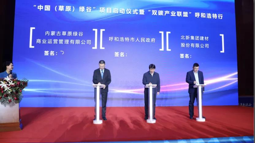 盤古智庫秘書長、中美綠色基金CEO王俊灃,呼和浩特市副市長張永文、北新建材董事長王兵進行三方簽約
